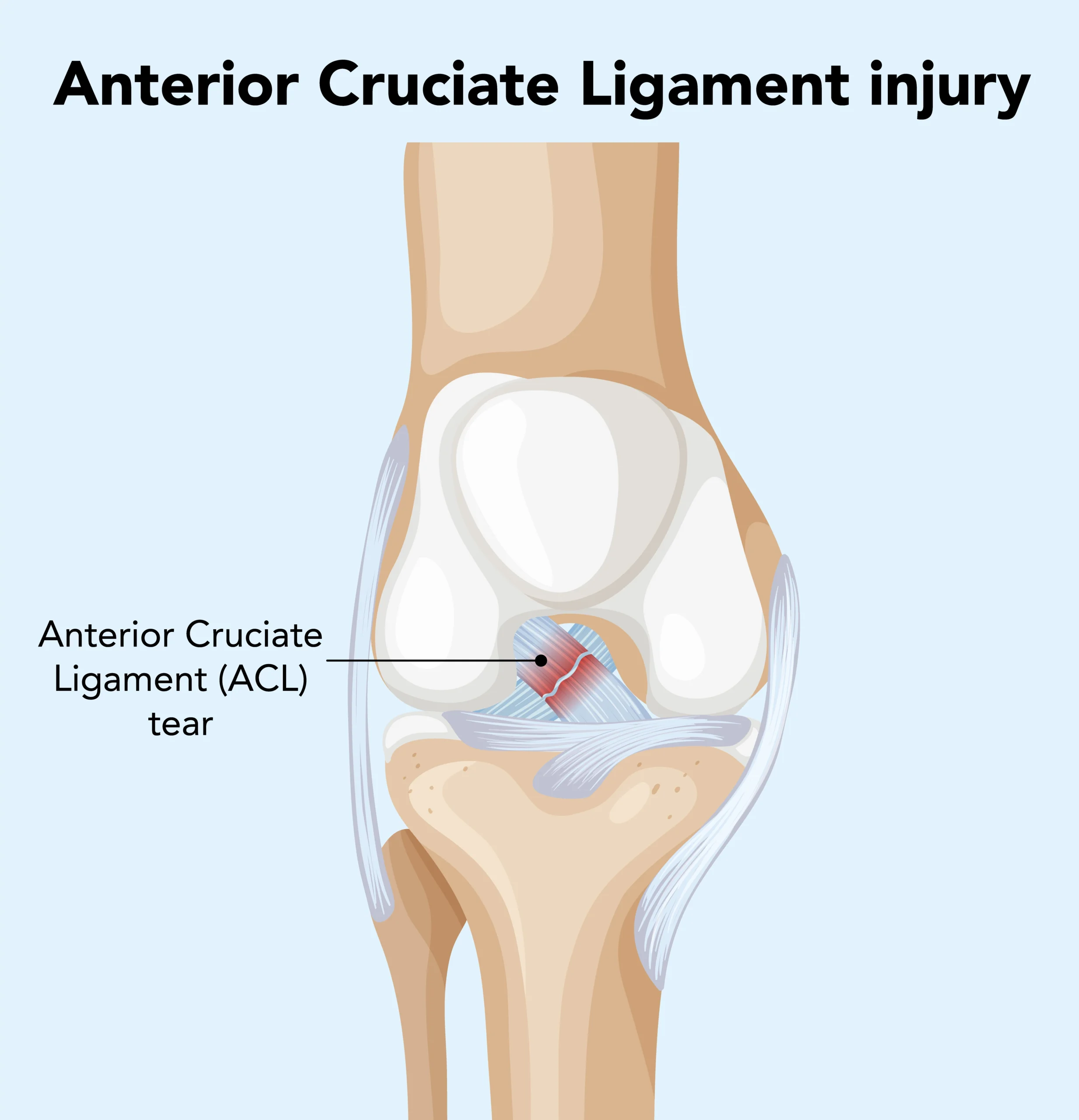 An ACL injury is a tear or sprain of the anterior cruciate ligament. ACL is one of the strong bands of tissue that help connect your thigh bone (femur) to your leg bone (tibia). ACL is like a connecting strap that prevents your knee from bending or rotating too much. Anything that puts enough force on your knee to bend or twist it farther than its natural limit can injure or tear your ACL.